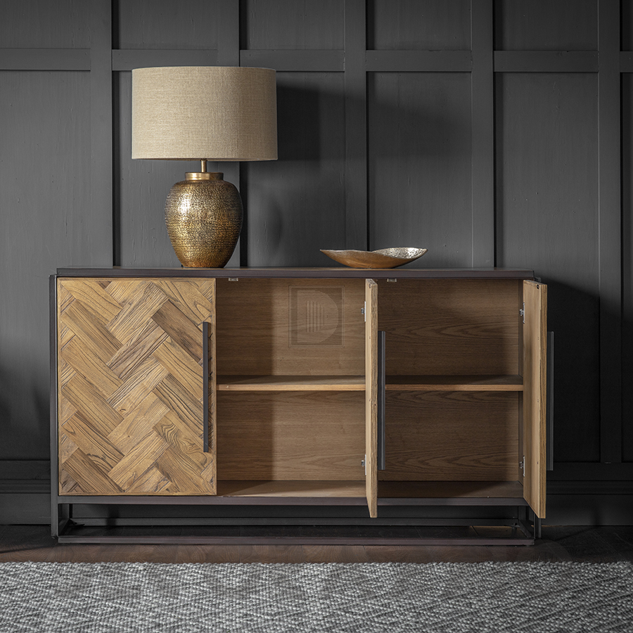 Паркетный 3-дверный буфет является последним в нашем ассортименте современной и современной мебели, эта потрясающая боковая доска изготовлена из натурального дерева вяза в паркетном дизайне, все в рамке из матового черного железа. Благодаря наличию трех дверей, каждая из которых имеет гладкую матовую черную железную ручку, эта деталь оказывается практичной как для хранения, так и для дизайна дома.