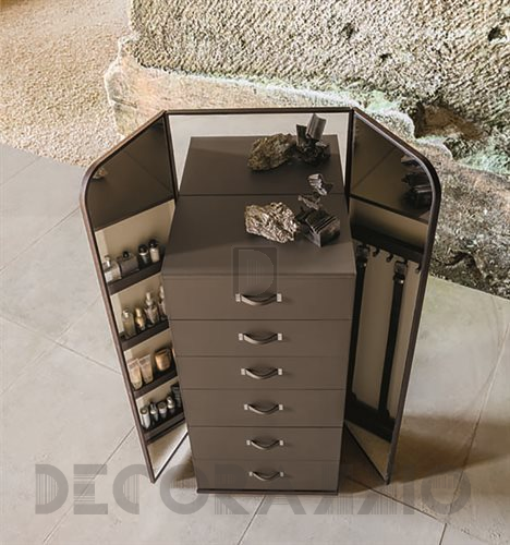 В конструкции комода Giano все идеально – от ящиков двух разных высот для оптимального размещения в них различных вещей и до двух вертикальных пространств по бокам, в которых расположены полочки и крючки для хранения галстуков и ремней. Giano оснащен двумя большими боковыми зеркалами, которые можно открывать или закрывать по необходимости. Центральное зеркало открыто всегда. Внутренняя отделка возможна в дубе termotrattato, черном дубе или в орехе, ящики и ручки с элементами, выполненными в черненом никеле, обтянуты кожей с контрастной прострочкой.