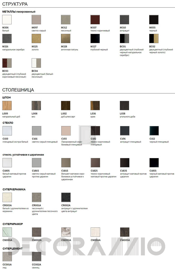 Основание из лакированной стали, шпонированного дерева или Супермрамора. Cтолешница стола может быть выполнена из шпонированного дерева, стекла, стекла, устойчивого к царапинам, СуперКерамики, СуперЦемента и СуперМрамора. Доступна широкая цветовая гамма согласно каталога производителя. Подробную информацию о товаре вы можете узнать обратившись к менеджерам салона.