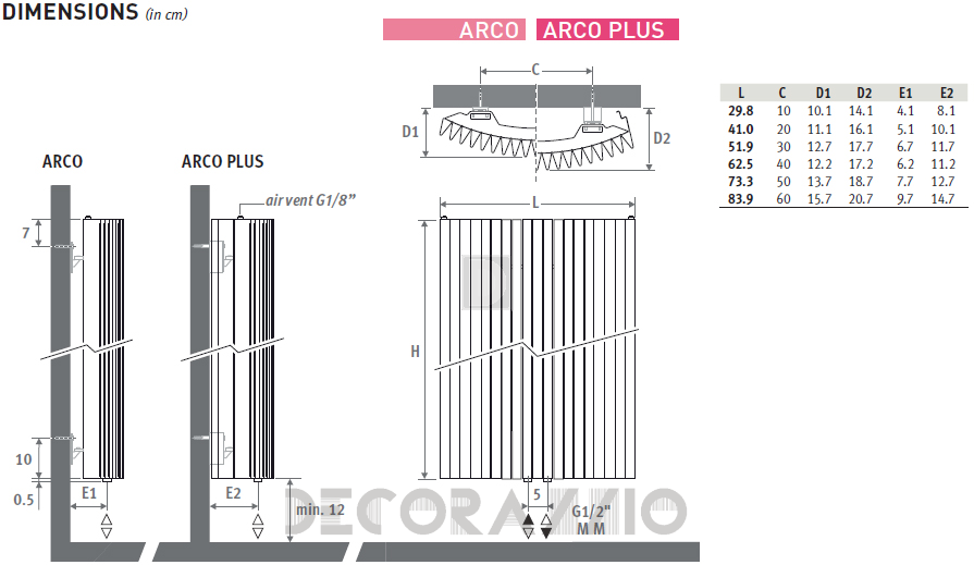 Под заказ доступны размеры: 180/192/200/220/240 см (высота) x 29/41/51/62/73/83 см (длина), а также цвета из таблицы. В модели Arco Plus крепления к стене скрыты за декоративными магнитными накладками.