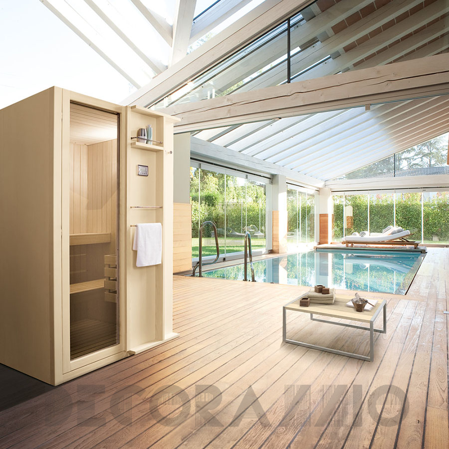 Максимальная мощность: Сауна 9 кВт. Двери и фиксированные панели выполнены из закаленного 6 мм стекла.