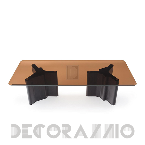 Фигурная внутренняя структура выполнена из МДФ, обшитая фанерой из шпона лиственницы, которая затем фрезерована по изогнутым краям. Основание из лиственницы, предварительно покрытое лаком Dove Grey и Licorice, может сочетаться со столешницей со следующей отделкой: окрашенный ясень с открытыми порами в цвете Licorice. Нижняя сторона имеет матовую поверхность того же цвета, что и верхняя, из стекла Smoked Glass, ламинированного до сверхпрозрачного, или стекла янтарного цвета. Столешница диаметром 150 см доступна только из мрамора Calacatta.