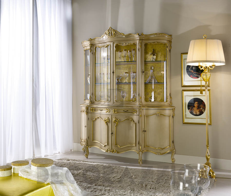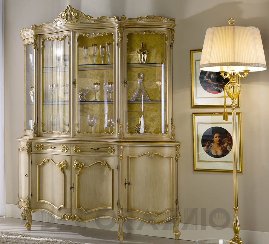 Витрина представлена в двух версиях: на 4 створки и 2 ящика, на 2 створки и 2 ящика (арт.81074, 135х50х223см). Предлагается широкий выбор отделок и тканей, разнообразие декоративных росписей.