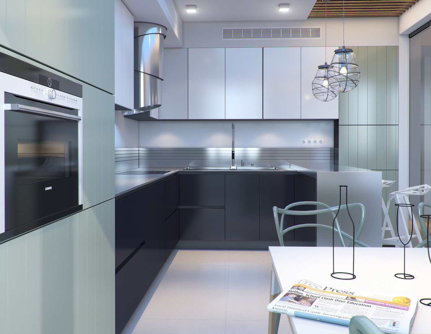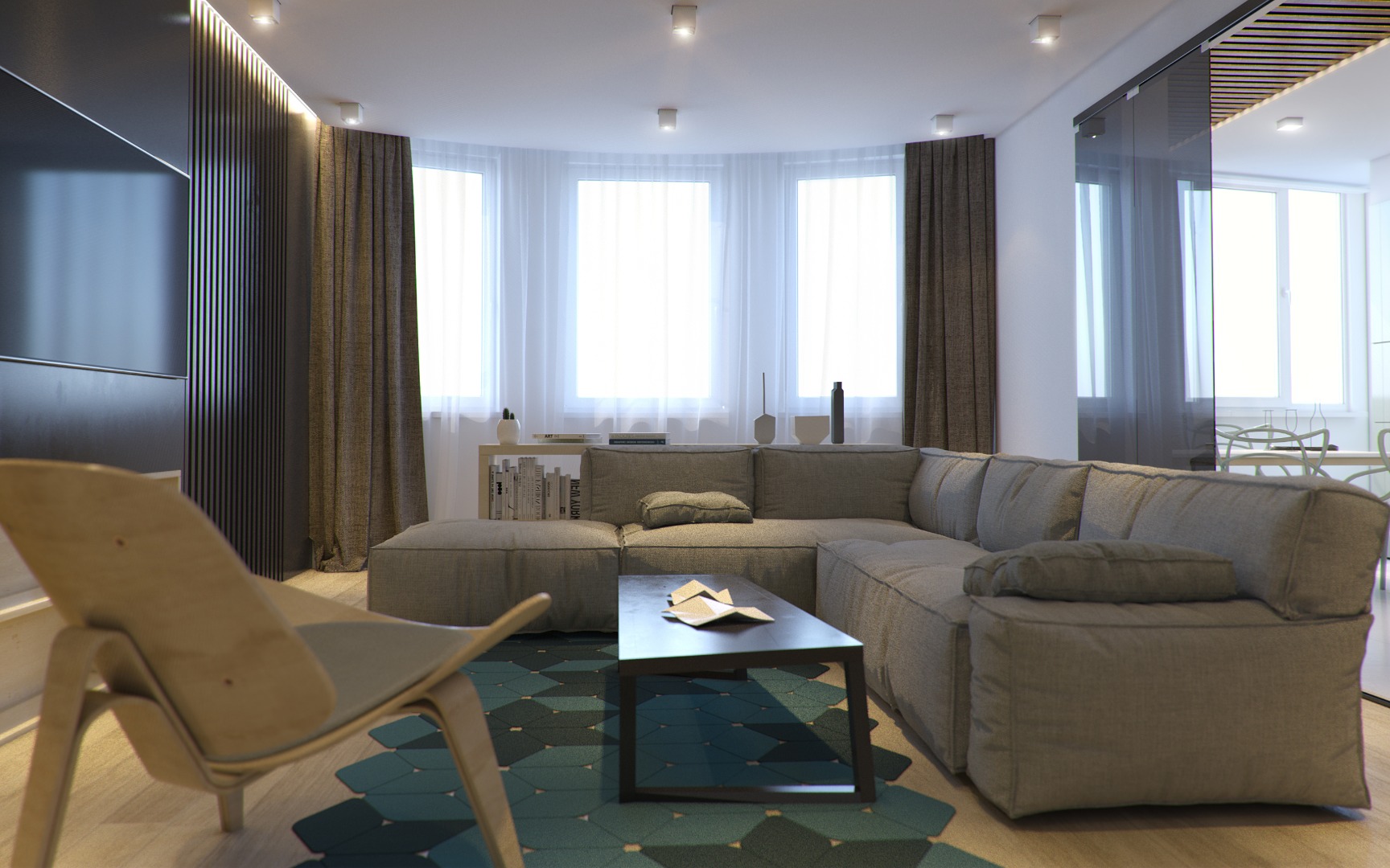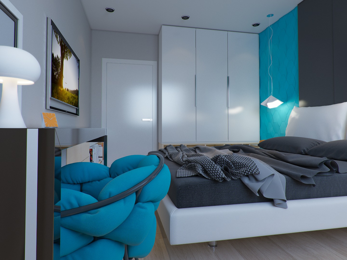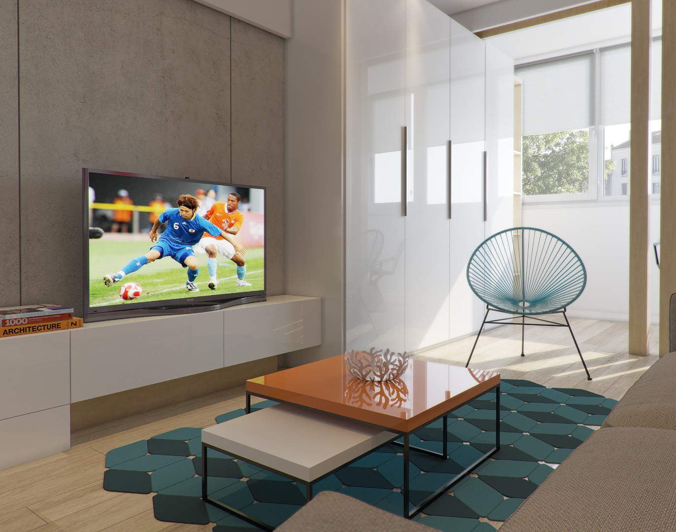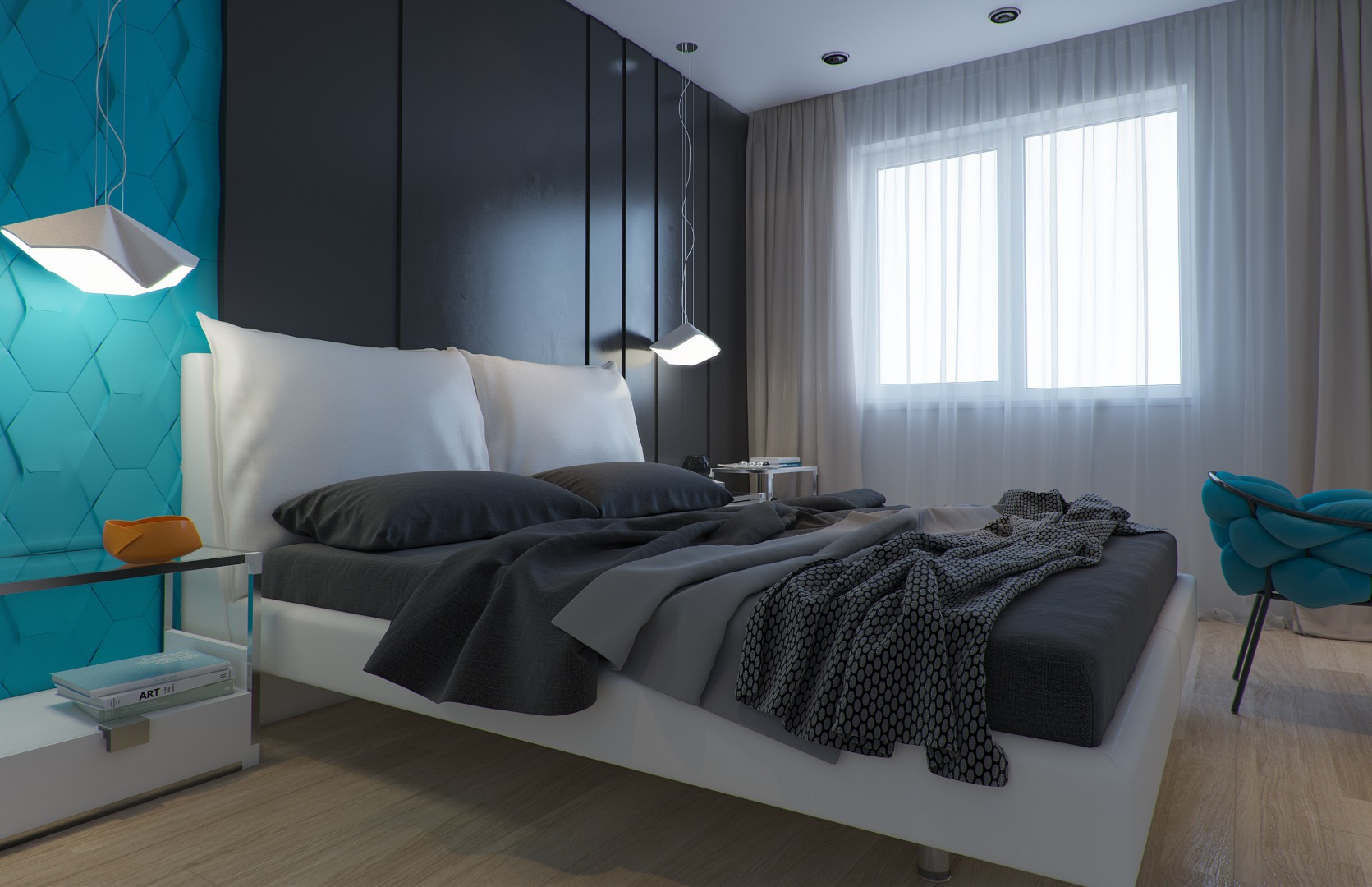 Хозяева этой квартиры площадью 75 кв. метра побоялись ярко оформлять весь дом. Но пестрых деталей им все-таки хотелось, поэтому они попросили добавить несколько акцентов в гостиной и спальне. В зоне отдыха за красочность отвечает стена, оформленная бирюзовыми 3D-панелями, а в гостиной притягивает взгляд апельсиновый журнальный стол и "поддерживающие" его цветные картины на стене.