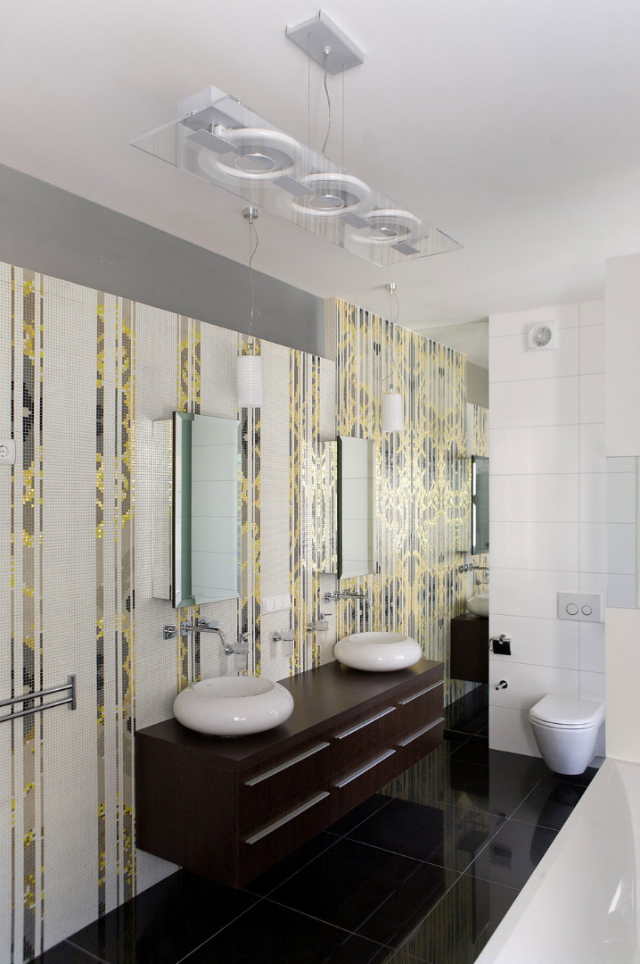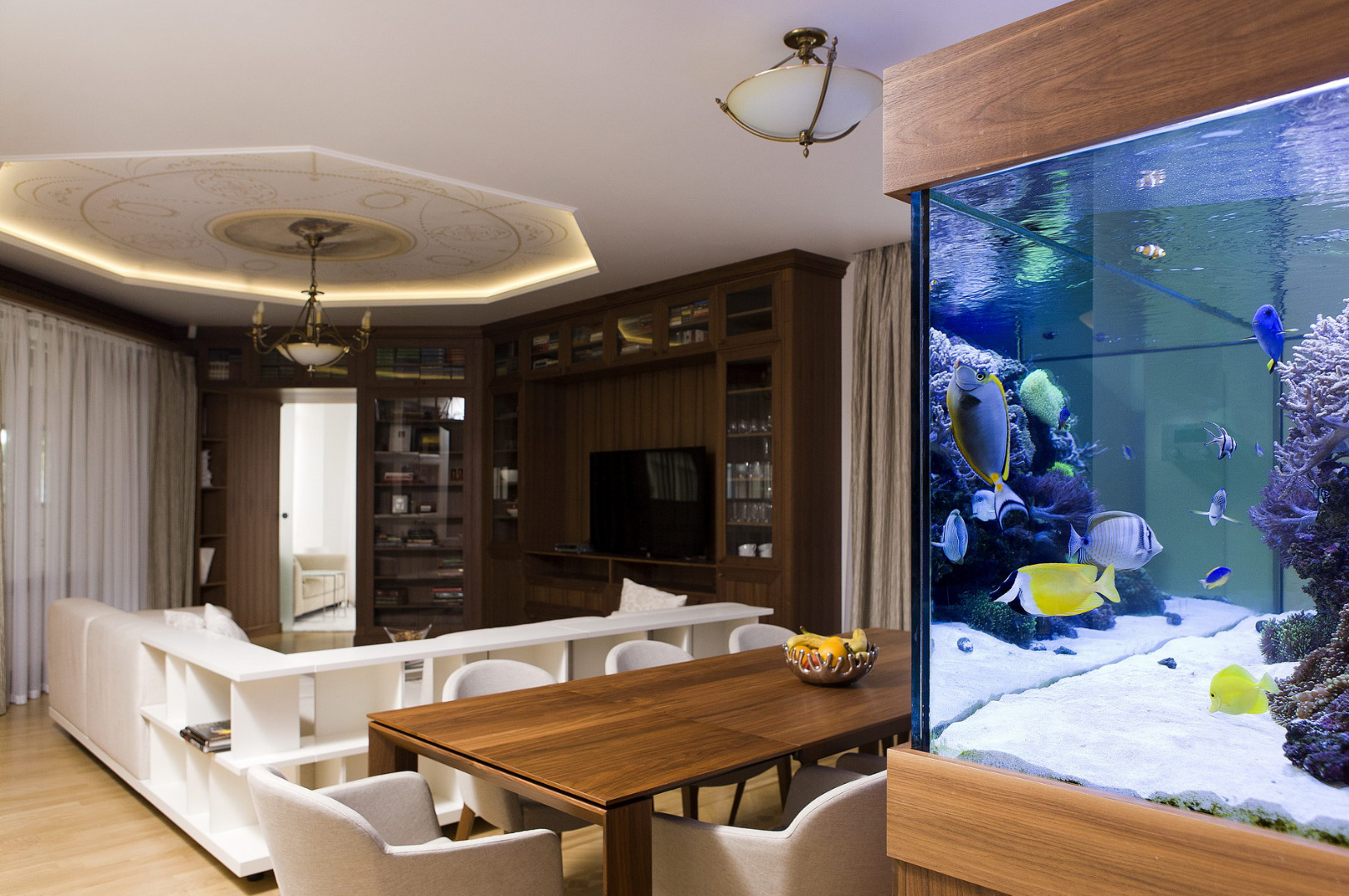 В гостиной тоже есть свои изюминки. Например, шкаф, который проектировался специально для коллекции виски. Это коллекция хозяина и, надо сказать, очень впечатляющая. Хочется отметить что именно, благодаря ей появилось название проекта и, собственно, началась работа над интерьером. Надо иметь завидную выдержку и самообладание, чтобы, любя так страстно этот напиток, просто смотреть на него каждый день, и все ! И этот человек этими качествами владеет. А коллекция его достойна того, чтобы весь интерьер начать именно с нее. Так все и было. Коллекция должна была занимать главное место в интерьере и все должно вращаться вокруг нее. Вообще мебель в гостиной проектировалась с таким расчетом, чтобы занимать как можно меньше, а вмещать как можно больше. Поэтому шкафами и полками занят практически весть периметр гостиной. В столовой зоне расположен роскошный морской аквариум. Он пока еще молодой, но когда подрастет – флора и фауна его будут гораздо пышней и разнообразней.