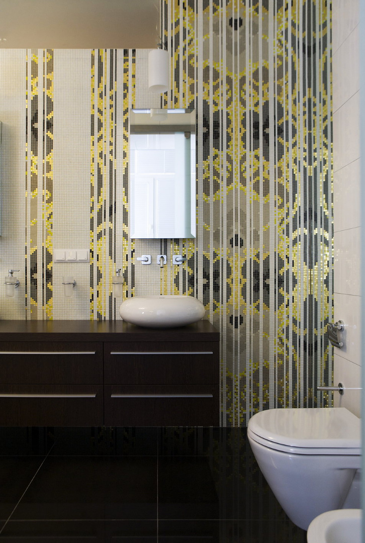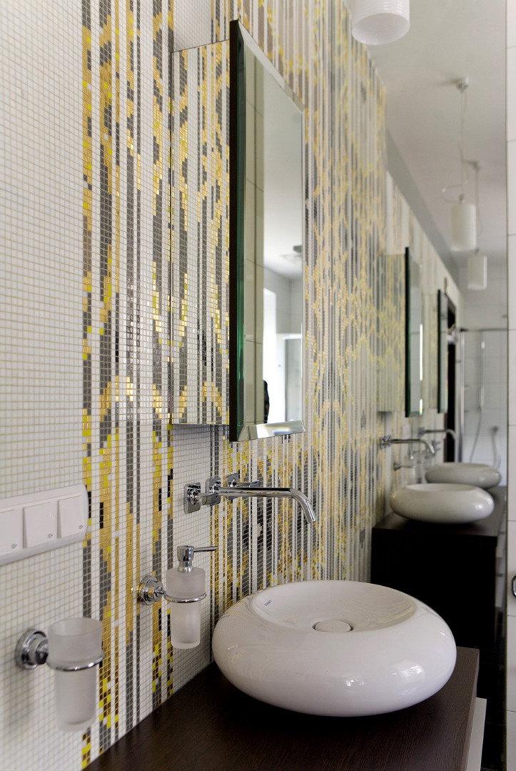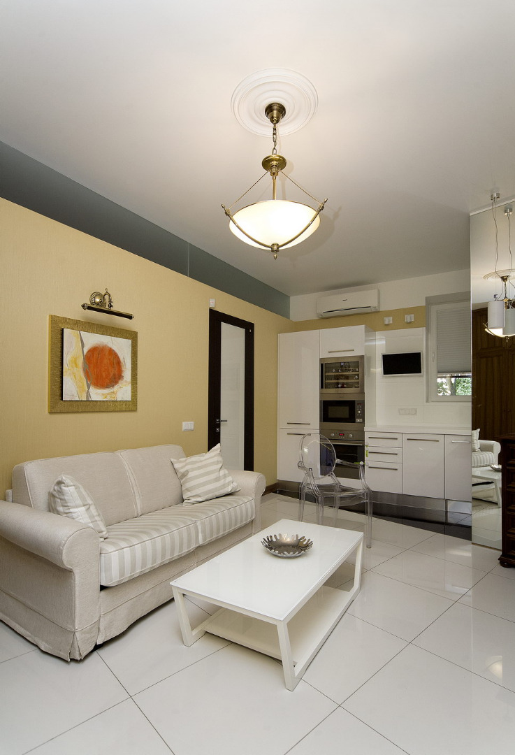 На базе всего оговоренного, я принял решение спрятать все самые явные кухонные приборы за ширму. Ширму я декорировал огромным цельным куском зеркала, что уже само по себе привлекает внимание. Это растворило ее и надежно спрятало кухню, отвлекая внимание входящего на свой собственный образ. И из-за того, что зеркало расположено под углом, интерьер исказился и вообще разбился на непонятные части, пересекающие друг друга и выплывающие одна из другой. Для усиления эффекта и, исходя из функциональной необходимости, я разделил зоны кухни и прихожей ( переговорной ) цветом плитки на полу. Таким образом, решились все задачи одним махом. Ну, а мягкий диван и журнальный столик – все, что надо для переговоров, логично завершили общую композицию.