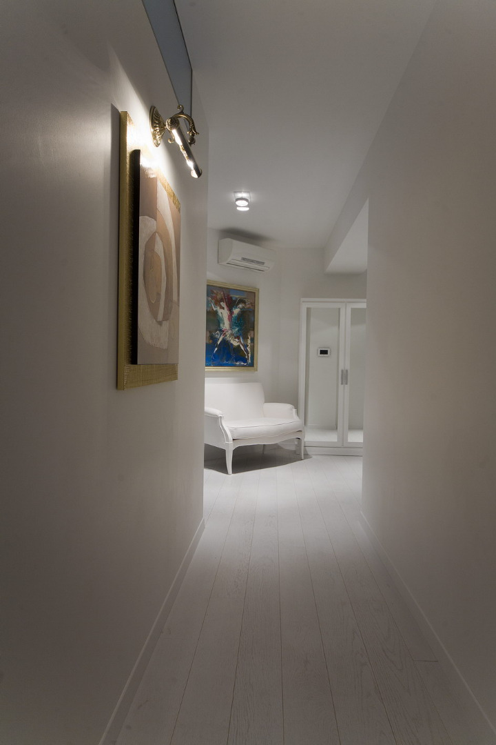 Задача была создать современный интерьер с элементами классики, не нагруженный и , на сколько это позволяла высота, объемно-просторный. В семье 4 человека. На такой площади свободно все разместились. В принципе планировка просто функциональна, без каких-либо не стандартных решений. Единственное, на что хотелось обратить внимание – это прихожая. Да, это не самая привлекательная часть квартиры, но в нашем случае она несет в себе гораздо больше функций, чем просто входная зона. Хозяин квартиры деловой человек. Некоторые встречи он проводит дома, но не желает заводить гостей в жилую часть. Поэтому просил сделать так, чтобы прихожая была как можно меньше прихожей, а больше комнатой для переговоров и немножко кухней. Нужно устроить все так, чтобы входящий чувствовал бы себя как в офисе, сильно не расслаблялся и, при этом, он не должен глазеть на квартиру. А кухня нужна в минимальной наборке, потому что мы чаще кушаем в ресторане. Она должна быть спрятана и не бросаться в глаза.