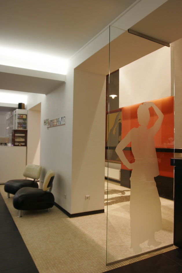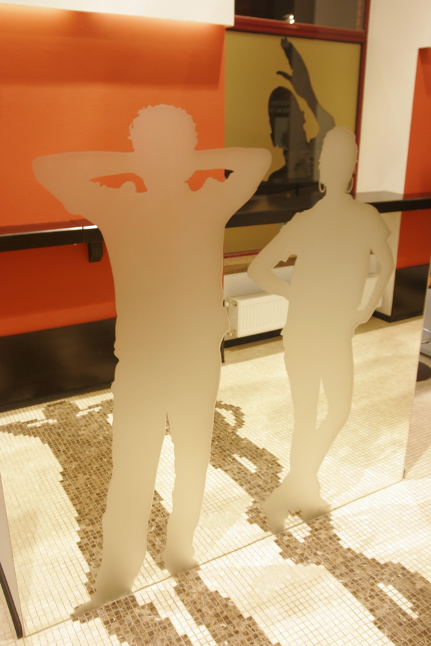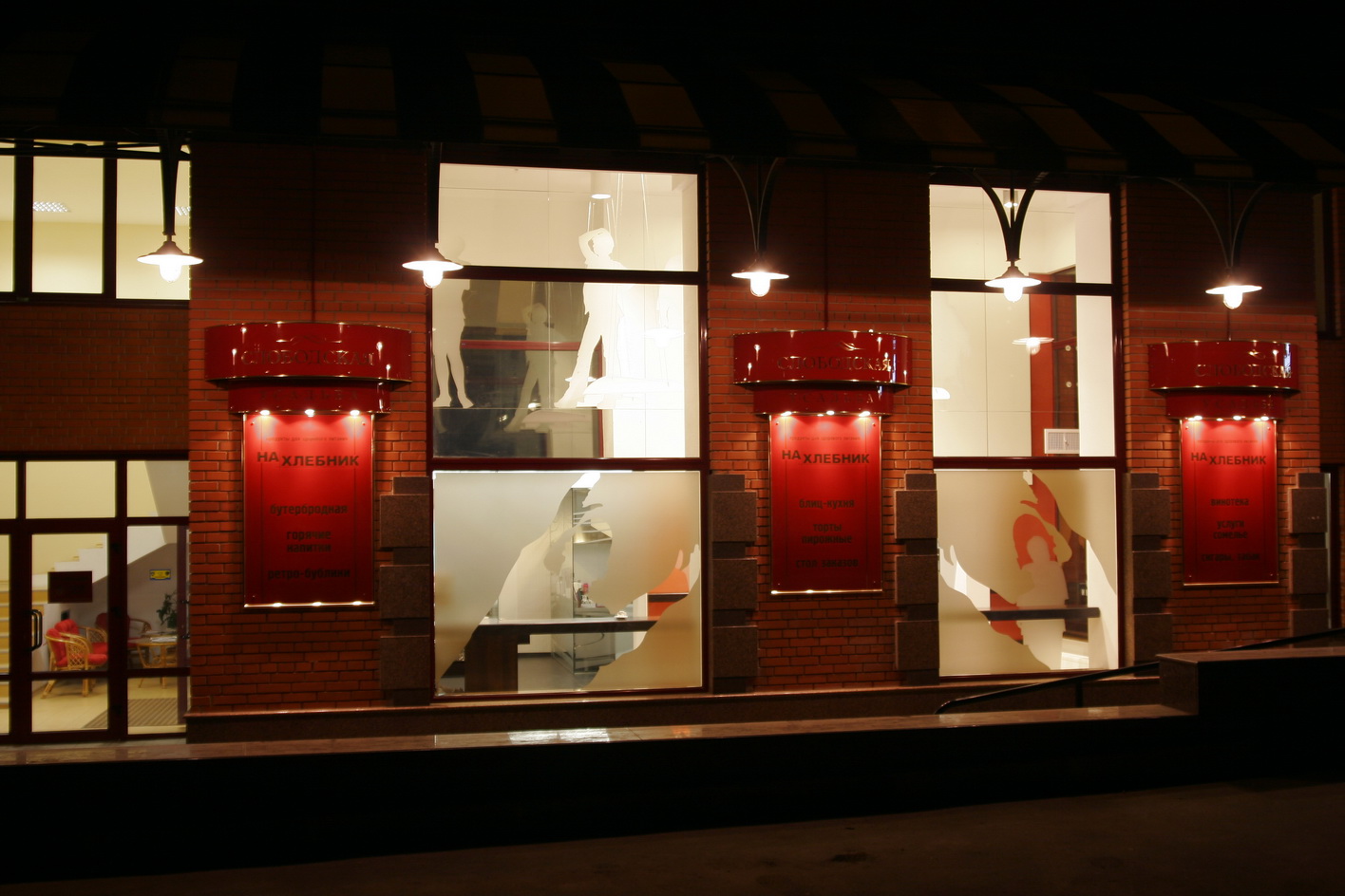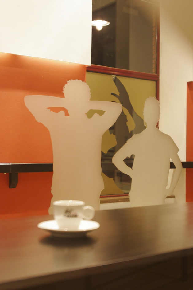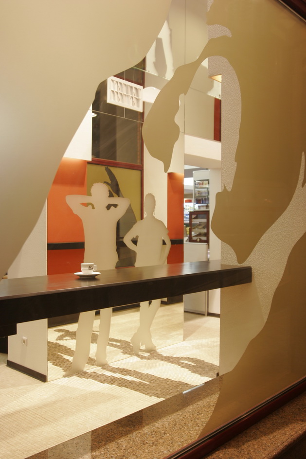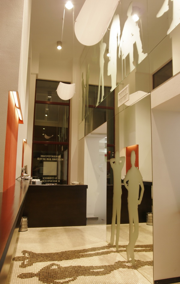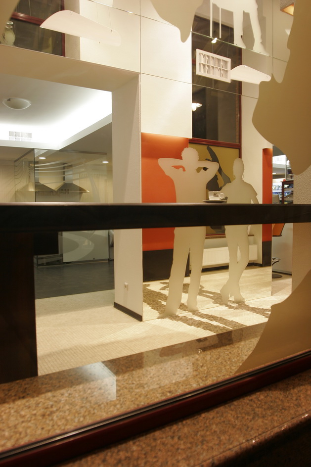 Ресторан расположен в доме, с которого в Харькове началось элитное строительство. Ориентир ресторана - жильцы дома. Предполагалось, что только для жильцов он и будет использоваться. Заказы завтраков, обедов, ужинов, праздничных столов и т.д. Но время показало, что случайные прохожие - тоже не будут лишними клиентами. Но, не планируя объект для общего пользования, никто не думал о его внешнем виде. И теперь, когда стал вопрос его "выхода в свет", ему просто необходимо красивое лицо. Я сделал интерьер частью улицы. Так как окна витрины очень близко расположены к прохожим, я решил просто привлечь внимание необычными витринами, которые как бы заглядывают внутрь ресторана. Внутри расположены силуэты посетителей, которые были списаны с владельцев и работников этого ресторана.