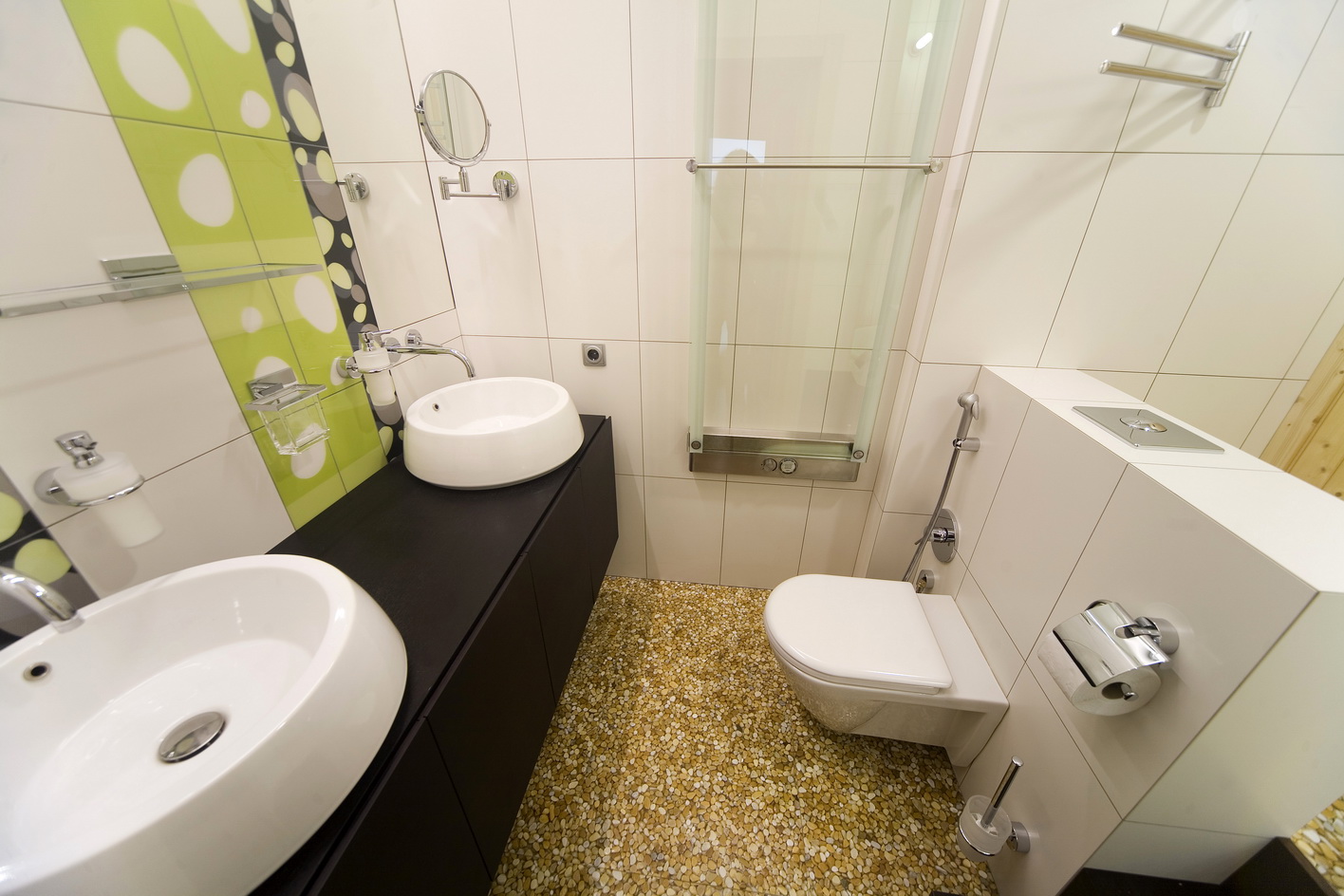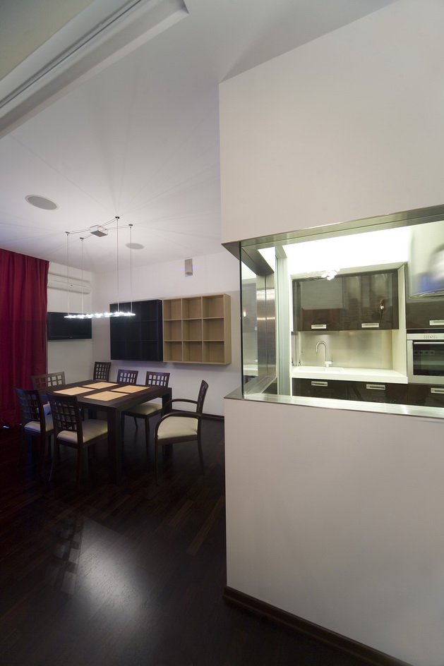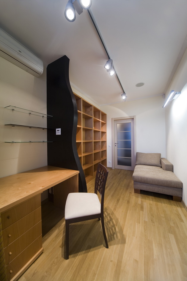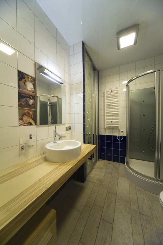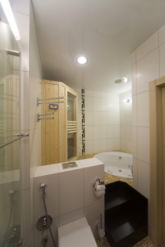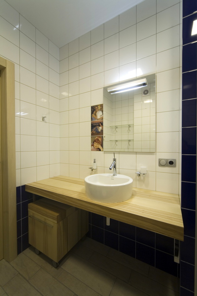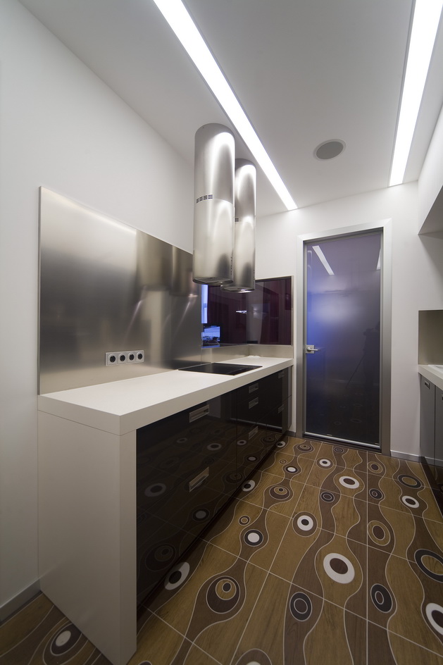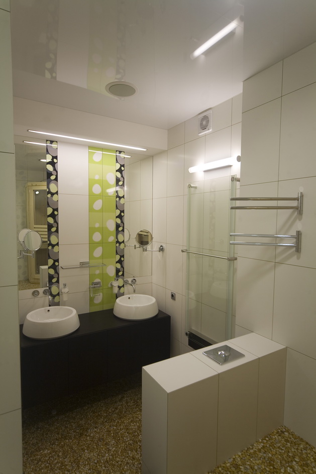 Киевская новостройка. Использование чистого белого цвета на гладкой поверхности на контрасте с камнем и цветовыми акцентами - главная тема интерьера.