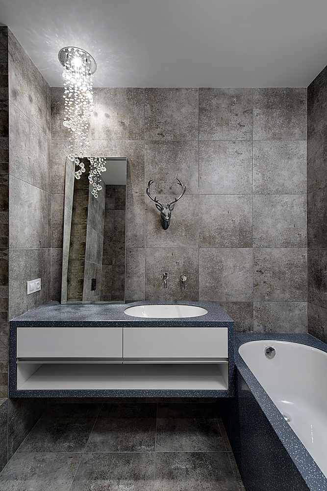 Особая уникальность этого интерьера в богатой колористике различных оттенков серого, что и определило его название. Если говорить о моде, то здесь соединились несколько трендов этого года: чистые простые линии, натуральные цвета, индустриальность и пэчворк. Если говорить о функции, то главной темой проекта стала идея создания максимально открытого пространства, с возможностью отделения приватных зон. Компромиссом между открытостью и приватностью стала идея использования стеклянных раздвижных дверей и штор с электроприводом, которые позволяют полностью отгородить пространство, при необходимости. Это создает возможность гибко регулировать полную открытость и надежную приватность этих зон.
