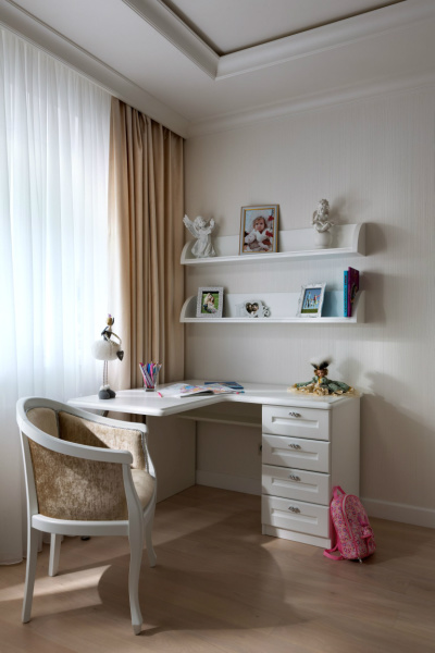 Уютная и светлая квартира выполнена в стиле современной классики. В интерьере преобладают белый и молочно-бежевые тона, мягкие, мерцающие текстуры. Большое количество освещения дополняет общий образ, заполняя пространство тёплым светом, играя в зеркальных отражениях, создавая праздничную сияющую атмосферу всего жилья.